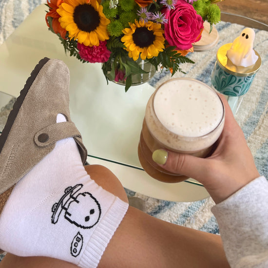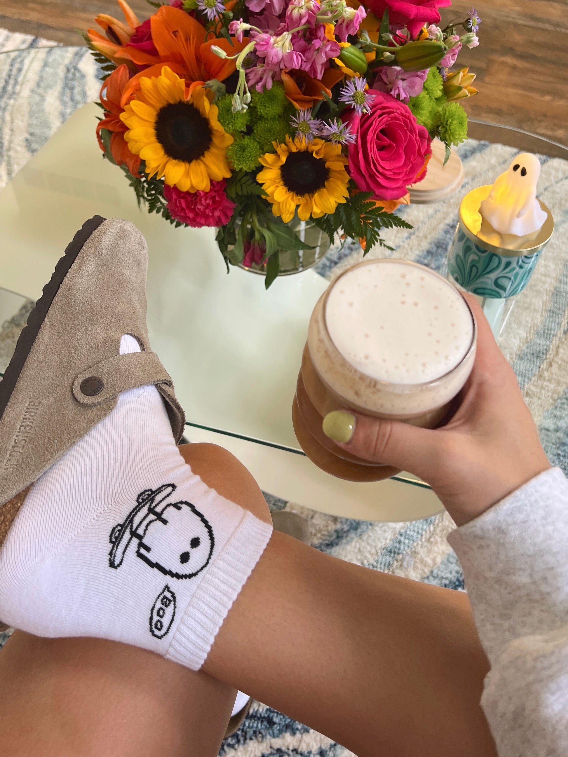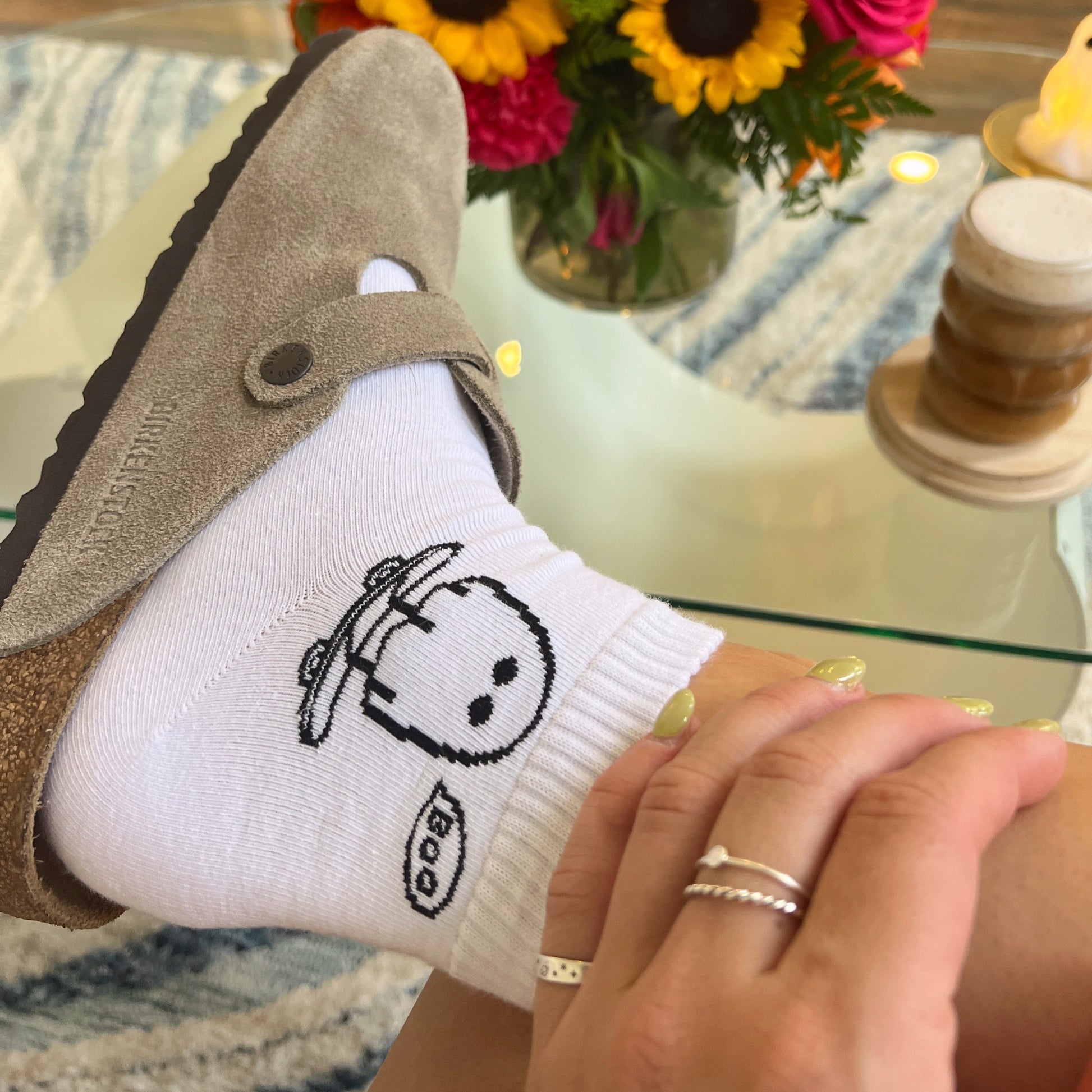 Everyone's favorite ghost is now available in socks. These socks are unisex and stretchy. Perfect for cozy days inside or to pair with your fave shoes! The design is printed on both sides above the ankle.