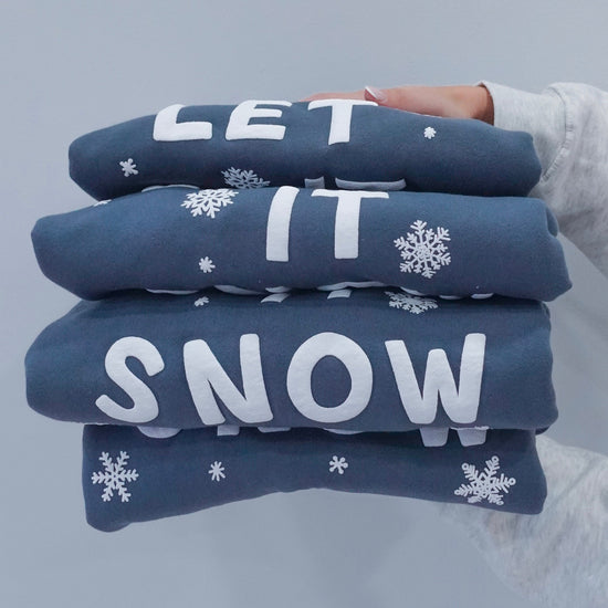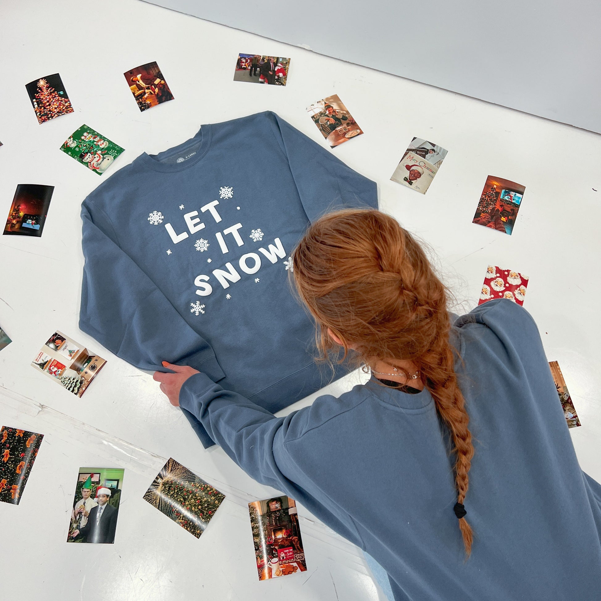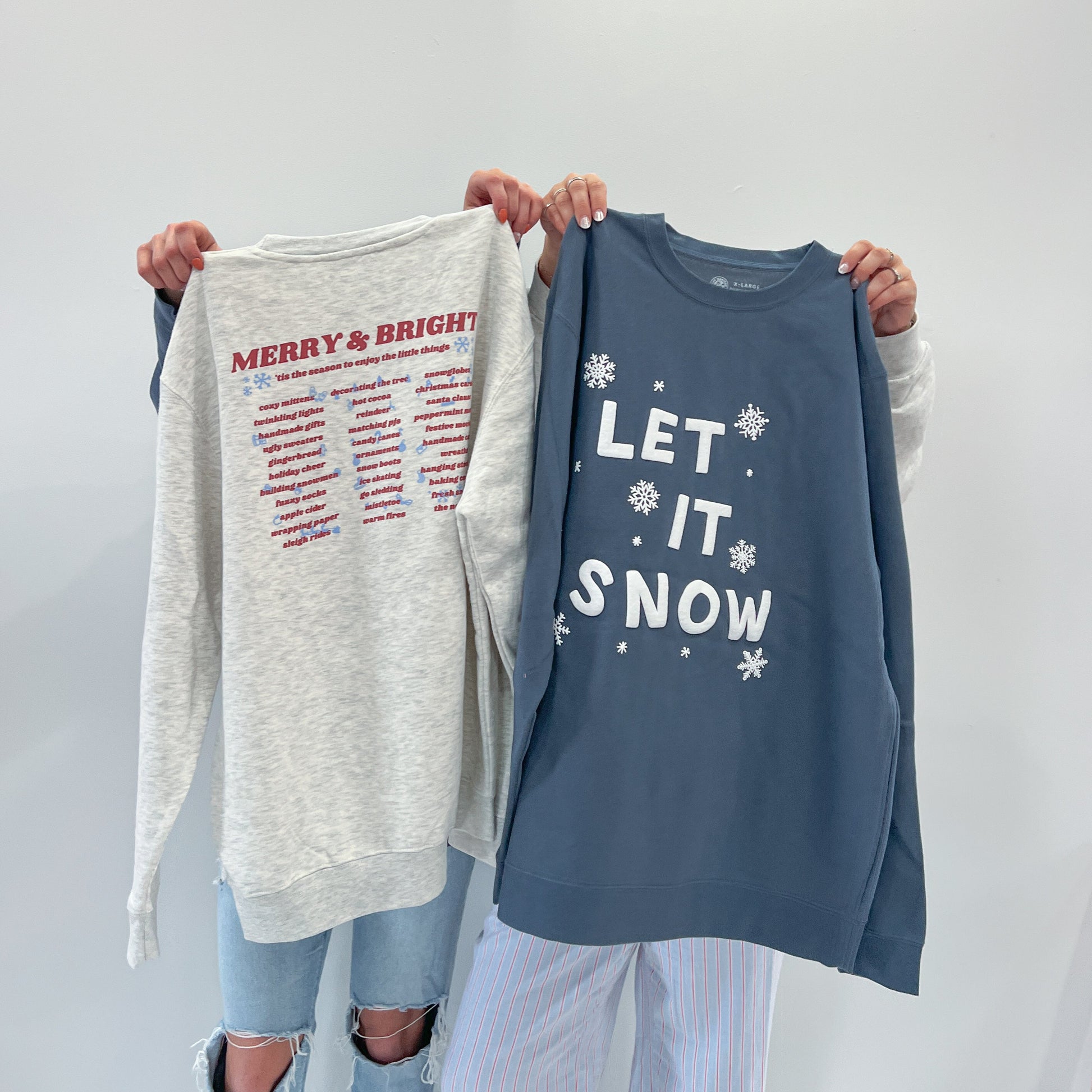 Let It Snow, Let It Snow, Let It Snow! This slate blue crewneck features a biiiig puff print design across the front and little snowflakes. We love the season-long vibes of this one & can't wait to wear it while sipping cocoa on a snowy evening!