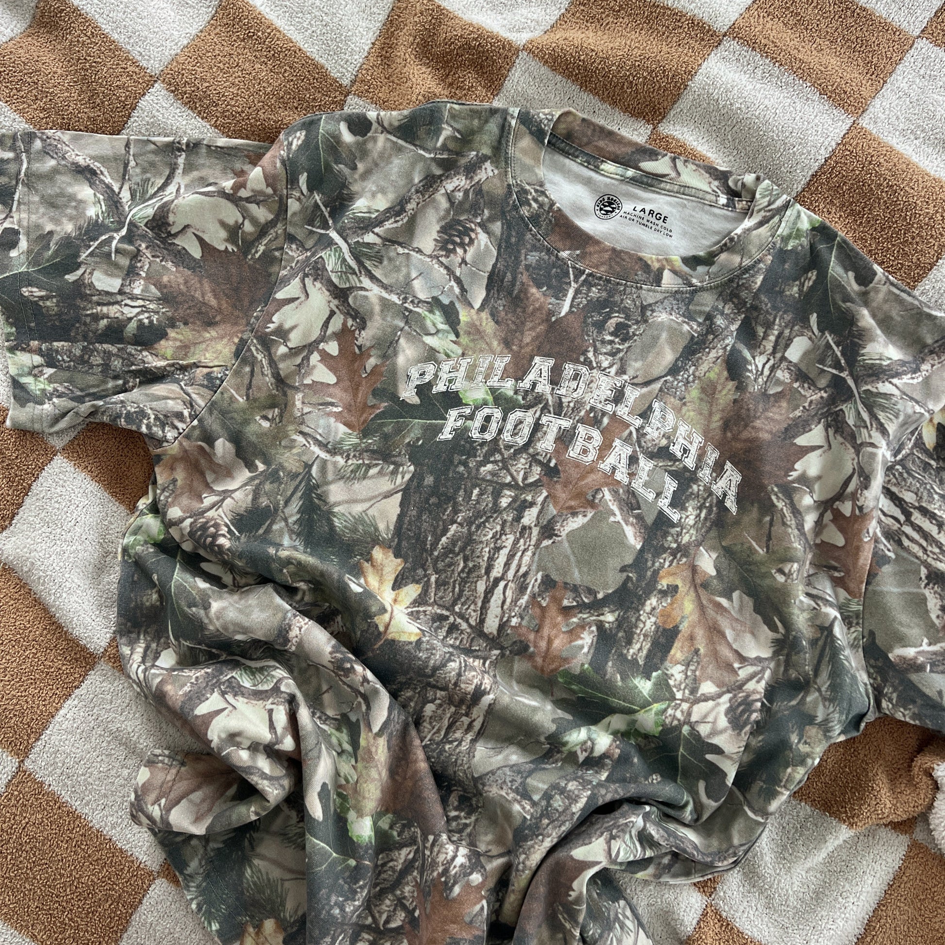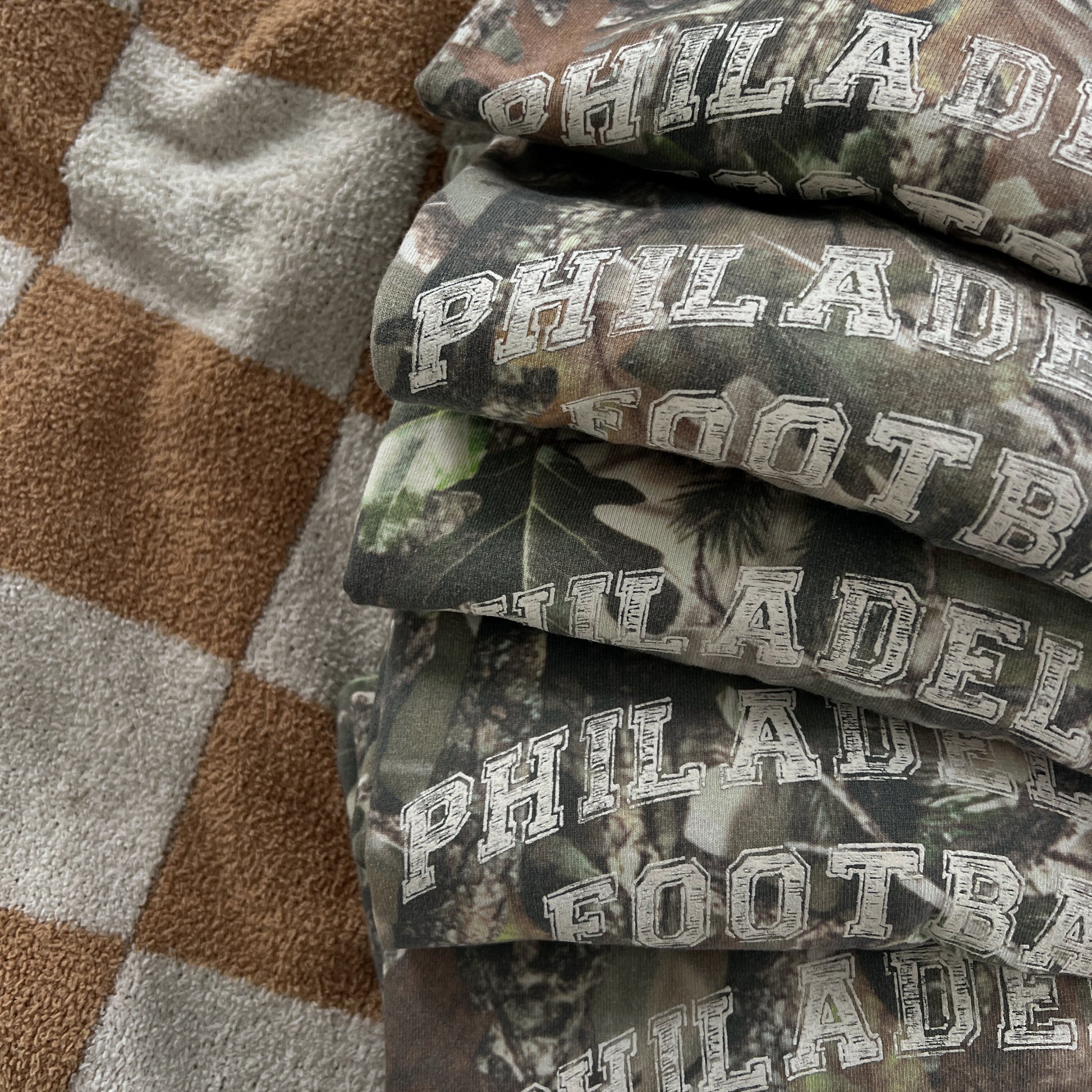 Go Birds, but make it camo! Each of these tees is entirely one of a kind, featuring a washed-out camo pattern and Philadelphia Football printed on the front.
