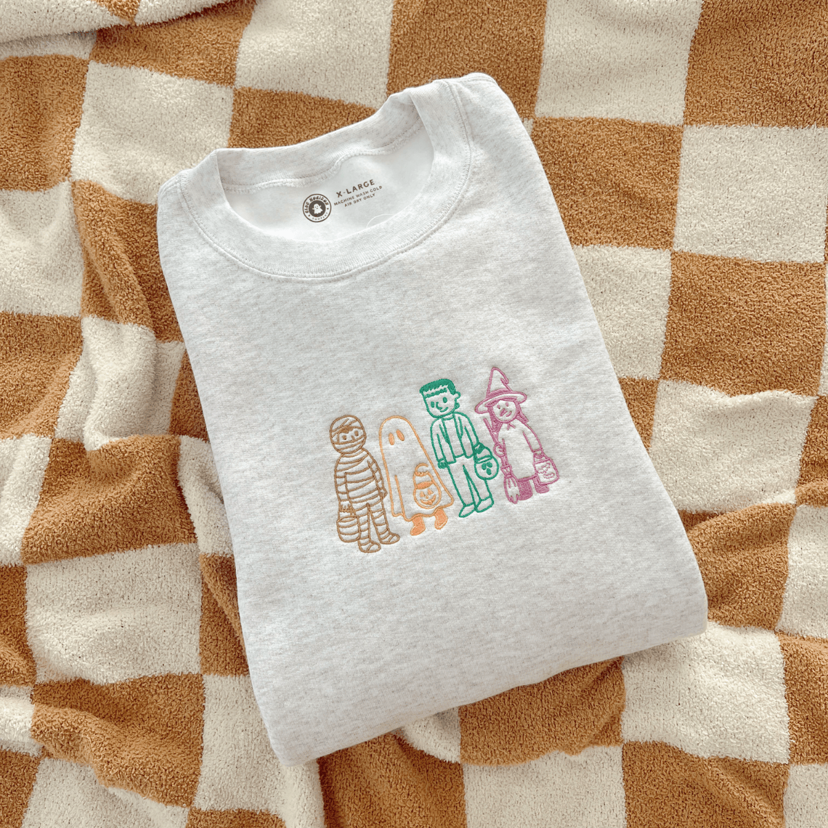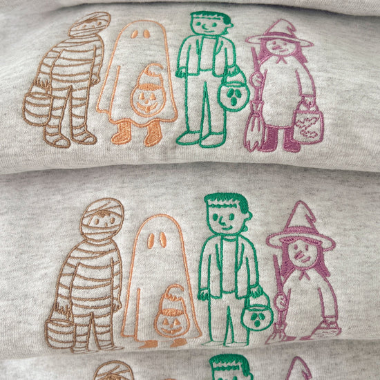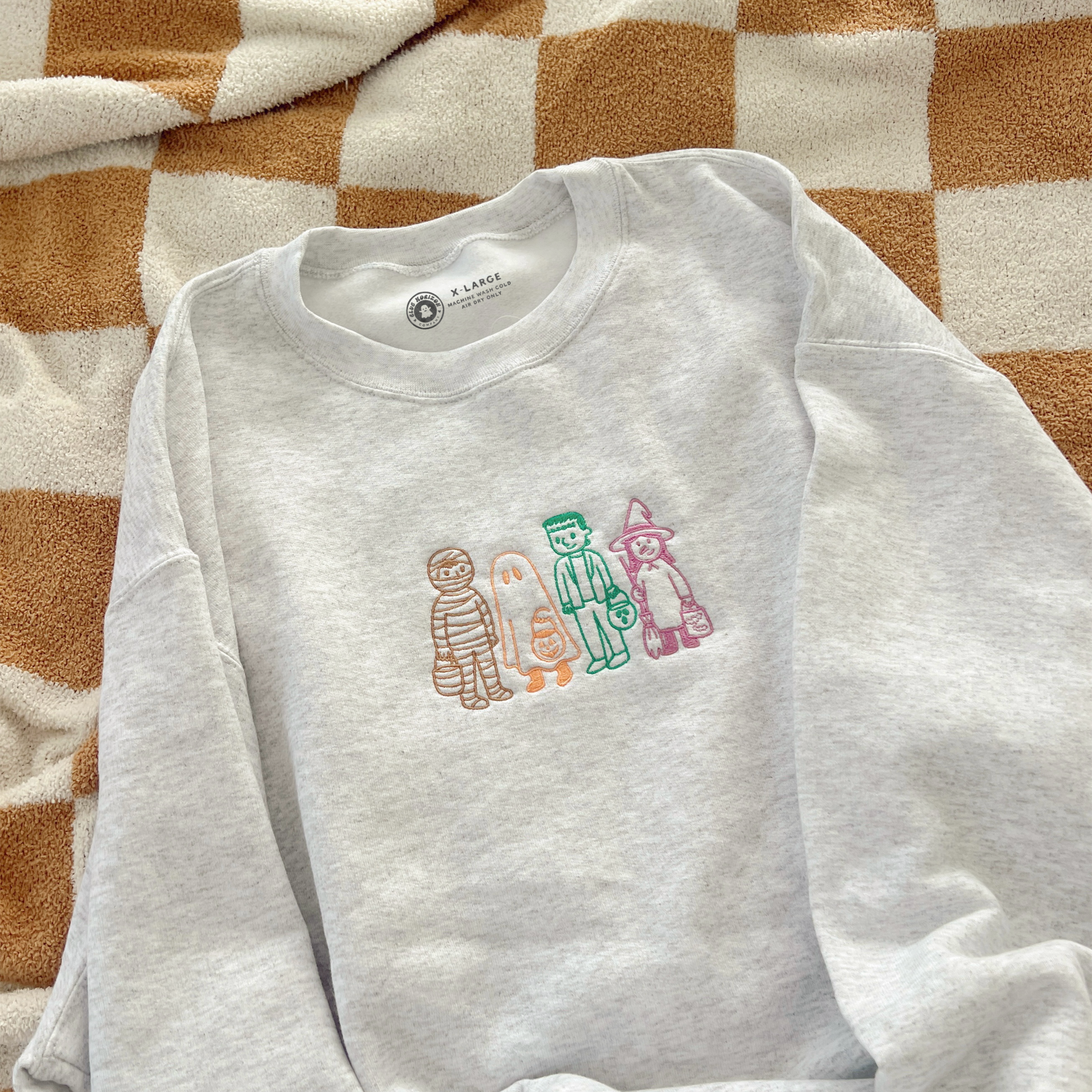 The perfect fall crewneck for anyone who prefers a subtle spook! The neutral ash gray crewneck features four little embroidered trick-or-treaters, all stitched in their own unique color - a mummy, a ghost (albert, is that you?), a monster & a witch!